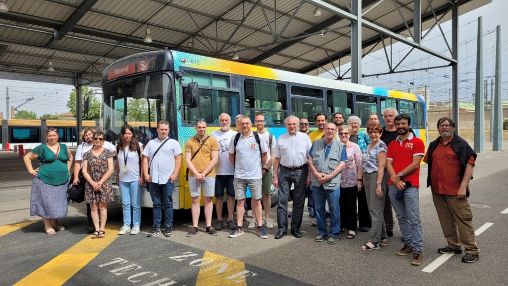 Le groupe devant le Heuliez GX 113 de l’ARTM, pendant la visite du dépôt Saint-Pierre de la RTM